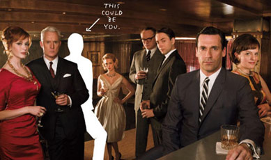 But now I fear for the youth of the country.  The photo on the left–which I believe I have legally downloaded from the Mad Men web site since it is an advertising gimmick, which is in itself pretty funny–says it all.  You can be in this photo.  And it seems that many people would very much like to be in it, at least judging by the Mad Men mania among the young, many of whom collected in Times Square tonight dressed in period costume.  The photo on the right is of a group of characters from The Wire, a show that struggled to stay on the air.  (Its last season overlapped with the first season of Mad Men.)  It never found a large following in its five seasons, although today it is considered by many critics and viewers to be the finest TV series ever produced.  It is set in present-day Baltimore and one of the things that it is about is how America is broken.  It is highly unlikely that The Wire could have advertised itself by holding a contest that says, you can be in this photo.