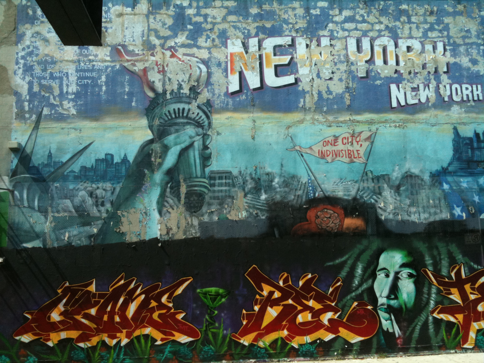 In northern Manhattan there was a man, an African American man, dressed in a manner that clearly identified him as a Muslim, trying to cross the street after the bus passed. I reacted. “What a brave man to announce his religious affiliation in this manner.” I was horrified. My immediate reaction was to fear for his safety because people would know his religion. I didn’t have time to consider, “Have we really come to this?” before the bus drove by the mural reproduced above. (Photographed with an iPhone.) It appears to have been painted around the time of 9/11 or shortly thereafter. (The bottom third is certainly more recent.) It speaks of unity. The unity of New Yorkers. The unity of Americans. Of all Americans.