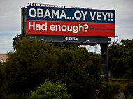 Now here is a simple thought experiment that will reveal just how out of touch these people are. Imagine Mitt Romney, the candidate these folks are supporting, uttering the words, “Obama…Oy Vey!” Any real Jewish American would be on their sides in stitches at the thought. Laughter that would wake the dead. And how could one not imagine Mitt trying to say Oy Vey after seeing these billboards along major highways?