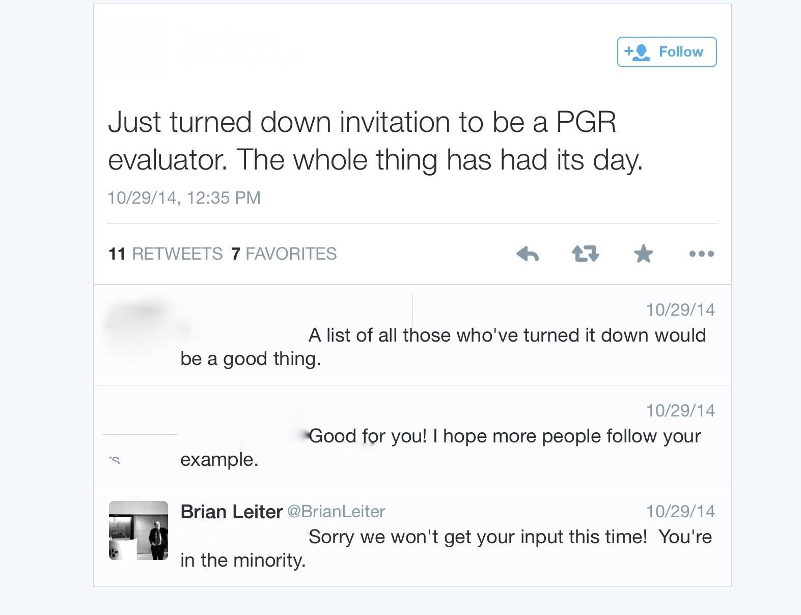 In a recent exchange with a chaired professor from the UK, in which the professor says that he will not be participating in the PGR this year, and states that “the whole thing has had its day,” and another respected philosophy professor chimes in, “a list of all those who’ve turned it down would be a good thing,” Leiter replies that he is sorry he won’t be receiving the professor’s input, but also declares, “You’re in the minority.”