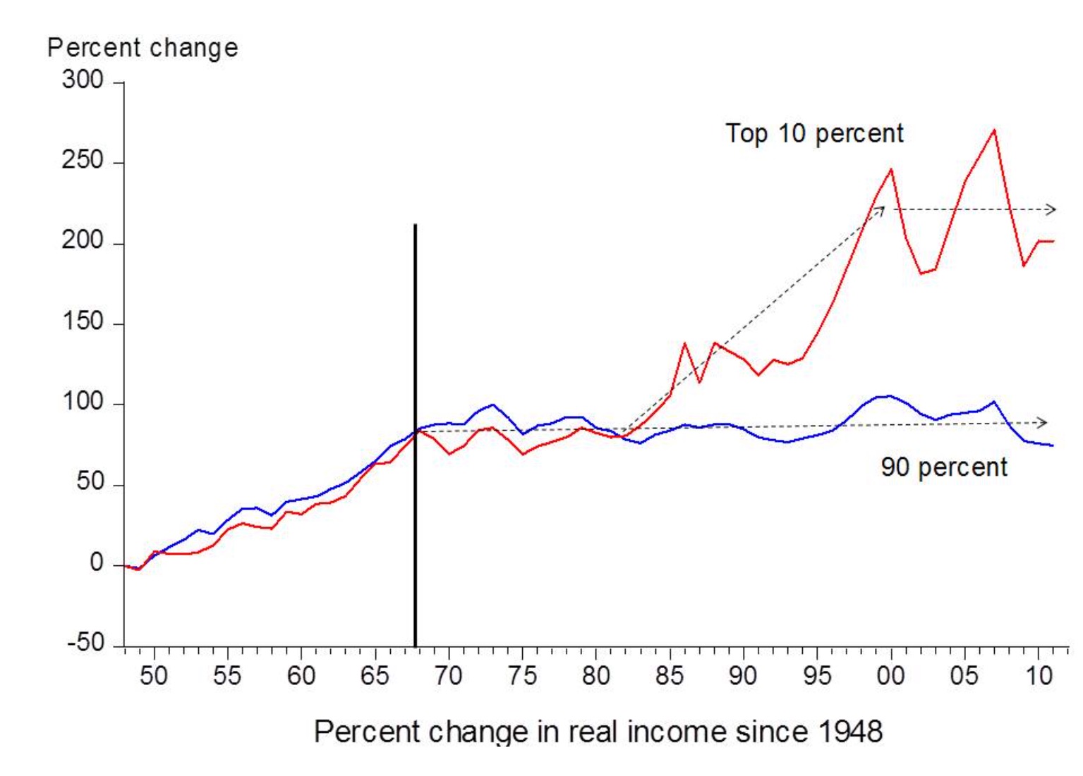 Which takes us back to the charts. How is it with all of our new technology and free markets, most of the population in the U.S. hasn’t seen an increase in their incomes since the late 1960’s? Reagan’s supply side economics didn’t make a difference. Neither did Clinton’s policies, or even the coincidence of his time in office with the tech boom of 1990’s. Neither did Bush’s or Obama’s economic policies.