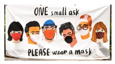 The illustrator of the poster “One Small Ask, Please Wear a Mask” was NinaChakrabati.  It appeared relatively early in the pandemic.  Today we would recommend N-95s or elastomerics over cloth or surgical masks.
